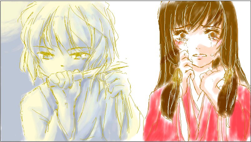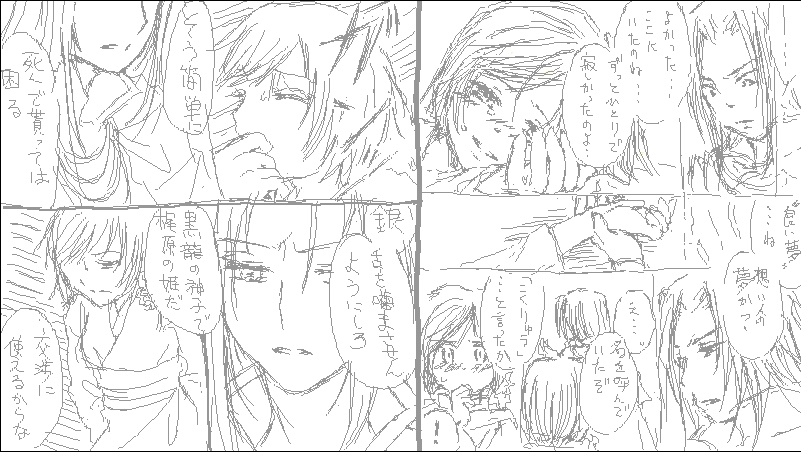 左:朔ちゃんの自害を暴力的にとめた総領殿(りこ) 右:黒髪長髪の泰衡様を高熱の所為で旦那と間違えた朔ちゃん(りんごちゃん)