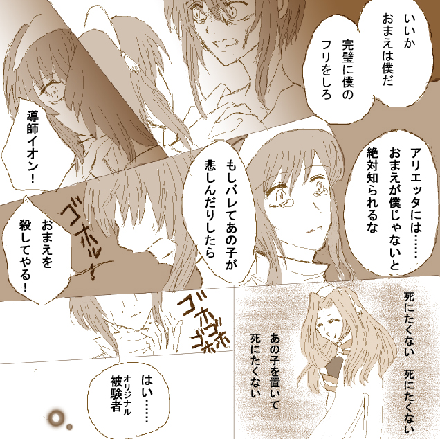 イオン様は序盤からアリエッタ嬢を何かと気にかけているので、 オリイオ様に色々言われていたんじゃないかなぁと捏造。 そしてイオン様は2年後ルークに会うまで ずっと「導師」という役割を演じてきたんだろうな。